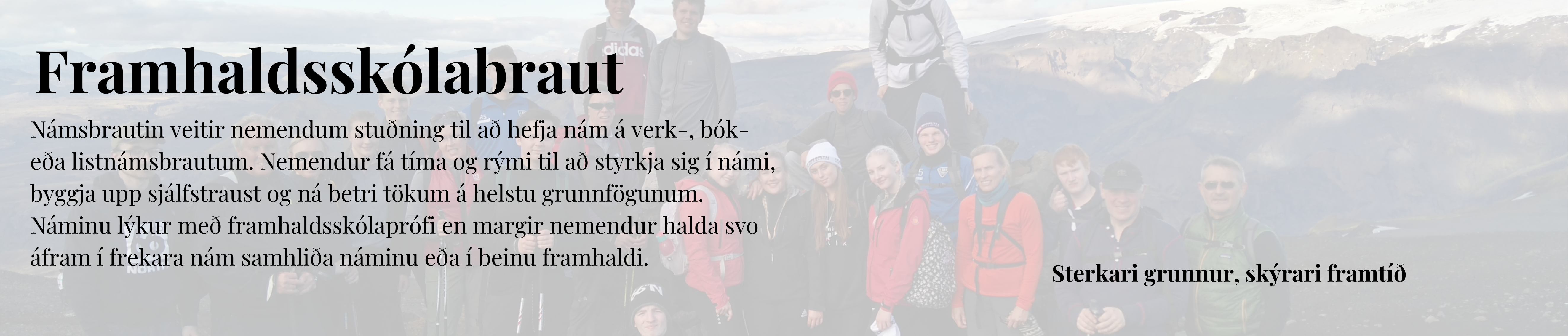 Lýsing: Námi á framhaldsskólabraut er ætlað að búa nemendur sem ekki hafa náð tilskyldum árangri á grunnskólaprófi undir nám á verk-, bók- eða listnámsbrautum skólans. Námið er að lágmarki 100 framhaldsskólaeiningar og því lýkur með framhaldsskólaprófi. Gert er ráð fyrir að stór hluti nemenda á framhaldsskólabrú hefji nám á annarri námsbraut í framhaldi af / samhliða námi á framhaldsskólabrú. Á brautinni er öflugt umsjónarkerfi, mikið samráð við forrsjáraðila og nemendur fá gott aðhald og góðan stuðning í námi.